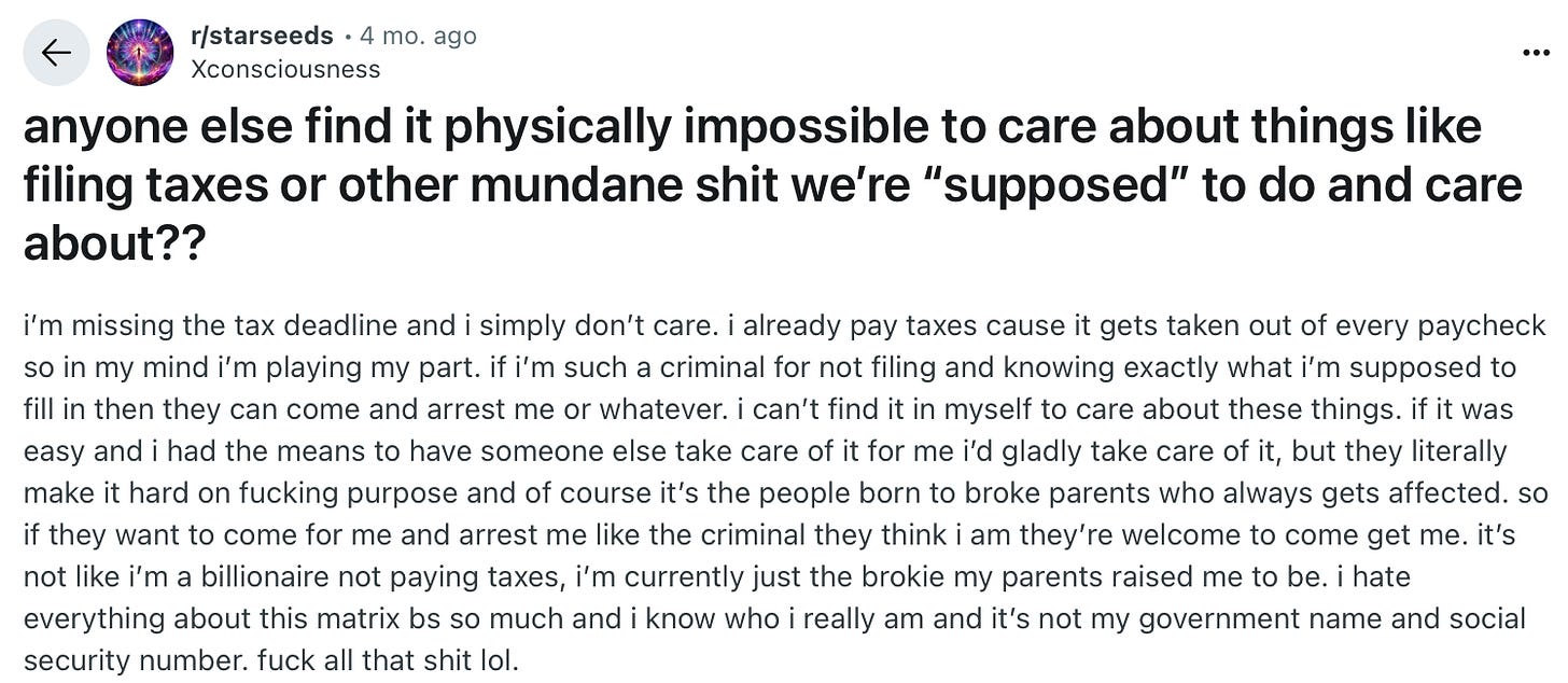 Alongside this, members of the community often hold views associated with broader conspiracy culture, such as skepticism toward vaccines, GMOs, fluoridated water, 5G, and the belief in chemtrails. But as I kept browsing r/starseeds, I also encountered a lot that I found quite liberatory and inspiring, like: