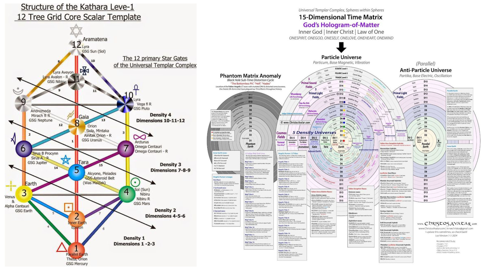 Regardless of the identity of the creators, the crux of the myth is that humans were originally created with 12 strands of DNA, each tied to a dimension of reality. These strands existed in subtler, non-physical form and granted us access to higher states of consciousness and multidimensional abilities such as clairvoyance and telepathy. These 12 strands are also mapped onto a 12-chakra system, extending beyond the traditional seven, which is frequently visualized through a Kabbalistic-style diagram called the Kathara Grid. Some Ascensionists expand this cosmology even further into 15 dimensions.