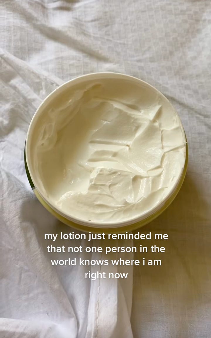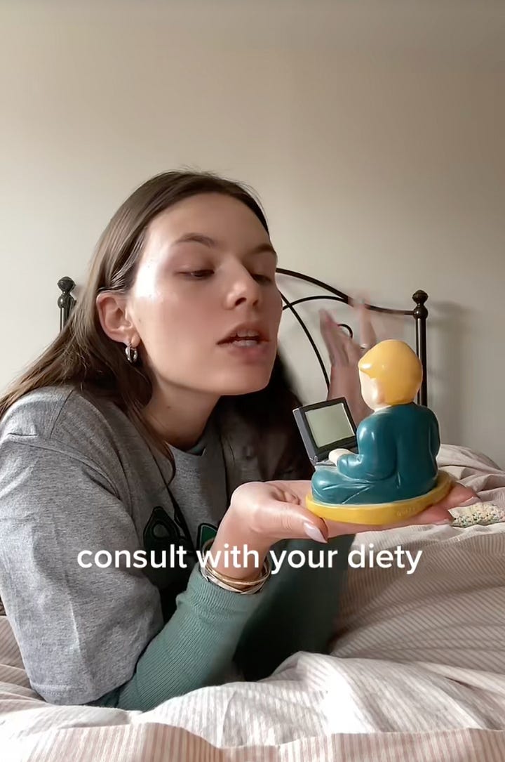To her 430k TikTok followers, she shares videos of herself engaged in daily tasks—hanging out in her room, eating an octopus tentacle—often accompanied by cryptic captions. On Instagram she posts memes, often assemblages of random-seeming images with spiritually-inflected quotes that make little sense on the surface, but somehow feel right. On Patreon, she offers guided meditations and life advice. On her website, she shares the more intimate details of her life in a digital diary that lives behind a paywall.