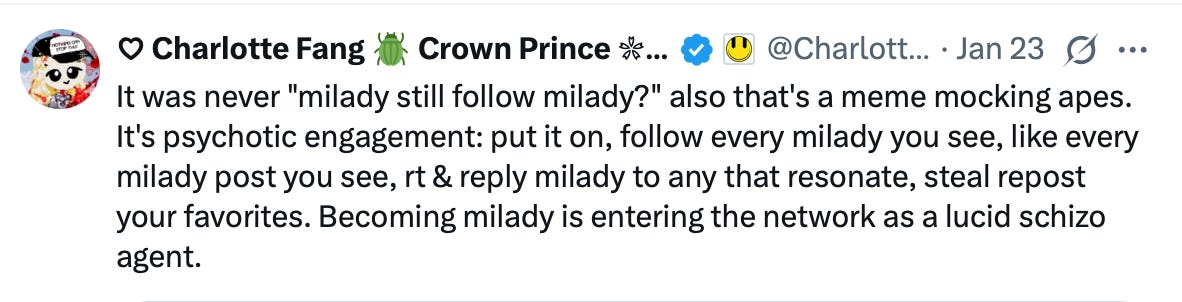 it’s psychotic engagement: put [the pfp] on, follow every milady you see, like every milady post you see, rt & reply milady to any that resonate, steal repost your favorites. Becoming milady is entering the network as a lucid schizo agent.