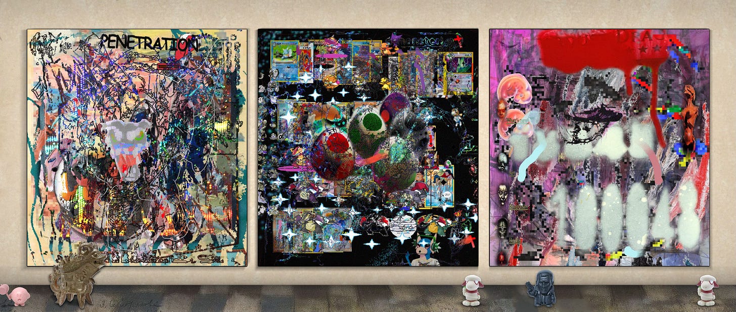 My X feed has been recently flooded with “traitmaxxed” NFTs, a style associated with Solana’s experimental “Gay NFT” scene that intentionally breaks the pfp format. Instead of assembling randomized traits—glasses, hairstyles, hats—into a coherent image, these works undermine the logic entirely, using the same process to create schizophrenic, multi-layered collages that draw from internet pop culture and renaissance painting alike.